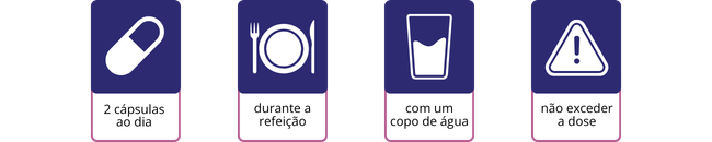 Ingerir 2 cápsulas ao dia, de preferência junto a uma das refeições, com um copo de água.