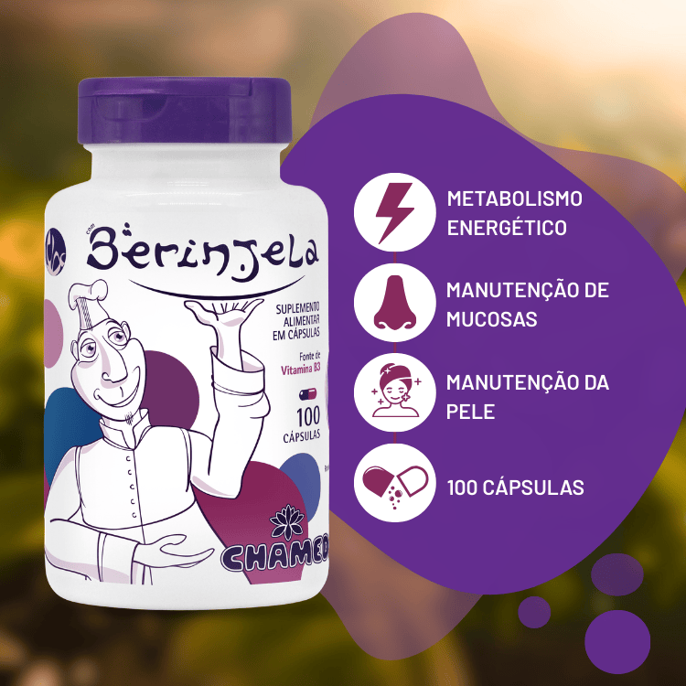 A berinjela é um vegetal amplamente consumido e cultivado em diversas regiões, reconhecido por seu formato característico e coloração arroxeada. Por meio da tecnologia aplicada pela Chamel, a berinjela é utilizada como ingrediente associado à vitamina B3, oferecendo uma alternativa para quem busca uma composição alinhada a uma rotina com vegetais na alimentação, sem abrir mão da praticidade da suplementação em cápsulas.