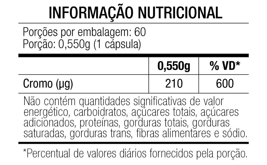 Ingredientes: Amido de mandioca, gelatina (cápsula), picolinato de cromo e antiumectante talco. NÃO CONTÉM GLÚTEN.