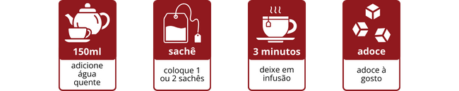 Aqueça 150 ml de água e coloque em uma xícara. Adicione 1 ou 2 sachês e deixe em infusão por 3 minutos. Se desejar, adoce com açúcar ou adoçante de sua preferência e aproveite!