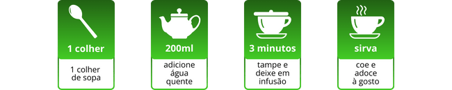 Coloque 1 colher de sopa do chá em uma xícara ou bule, adicione 200 ml de água quente, tampe e deixe em infusão por 3 minutos. Em seguida, coe, adoce com açúcar ou adoçante de sua preferência e aproveite cada gole.