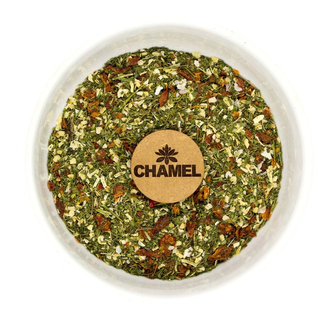 O tempero de cebola, salsa e tomate combina três ingredientes que se complementam de forma harmoniosa. A cebola traz intensidade e profundidade de sabor, o tomate acrescenta um toque levemente adocicado e suculento, enquanto a salsa confere frescor e aroma delicado.