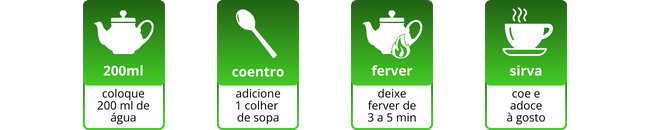 O chá de coentro é feito por decocção, ou seja, o coentro deve ser colocado na água enquanto ela ferve para extrair melhor o sabor e aroma.