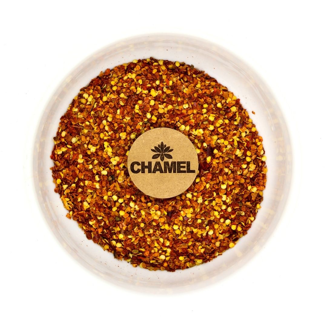 A pimenta calabresa é obtida a partir da desidratação e trituração de variedades de pimentas do gênero Capsicum sp., resultando em flocos avermelhados com pequenas sementes que concentram aroma e pungência. Seu sabor picante é intenso e marcante, tornando-a um dos condimentos mais apreciados na gastronomia.