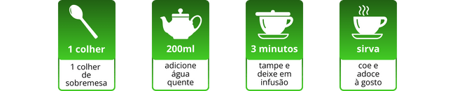 Coloque 1 colher de sobremesa do chá em uma xícara ou bule, adicione 200 ml de água quente, tampe e deixe em infusão por 3 minutos. Em seguida, coe, adoce com açúcar ou adoçante de sua preferência e aproveite cada gole.