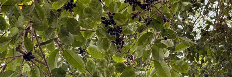 Jambolão é uma árvore tropical da família Myrtaceae, conhecida por suas folhas verde-escuras e frutos pequenos, ovais e de coloração roxa intensa quando maduros. É uma árvore perene que pode atingir até 15 metros de altura, sendo valorizada tanto por sua sombra quanto pelo apelo ornamental de seus frutos e flores.