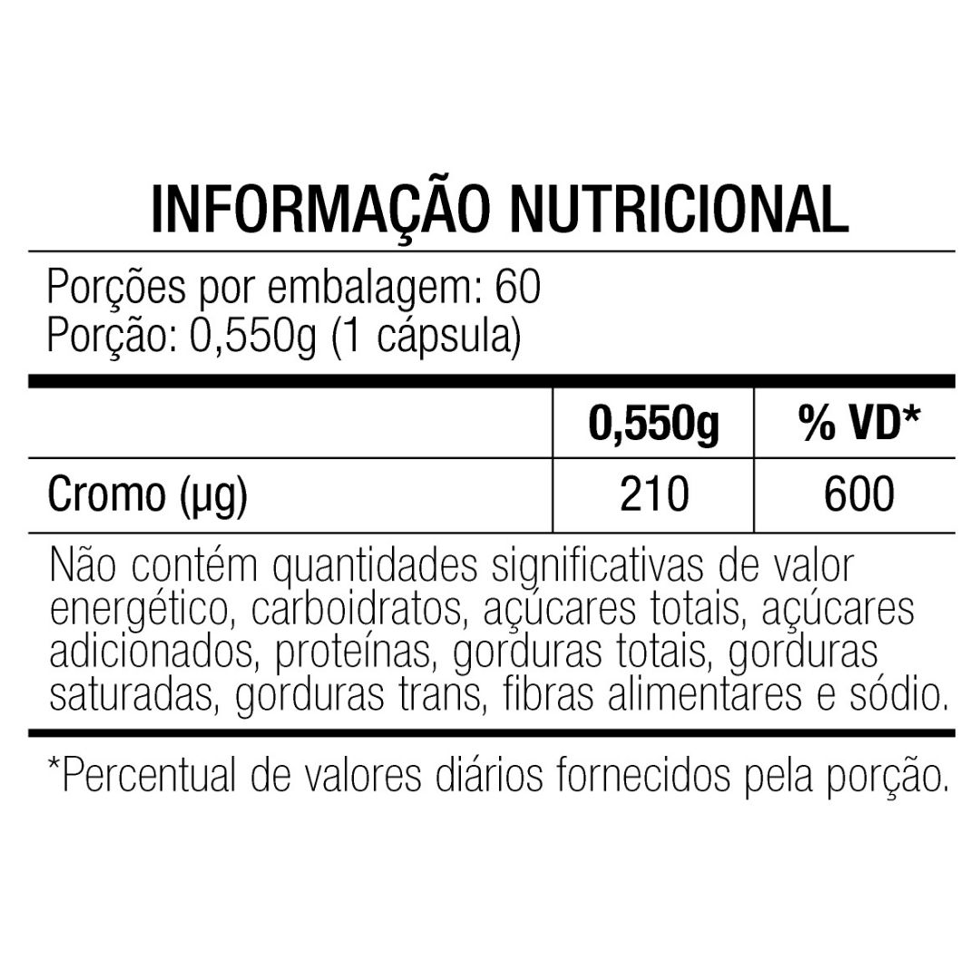 Ingredientes: Amido de mandioca, gelatina (cápsula), picolinato de cromo e antiumectante talco. NÃO CONTÉM GLÚTEN.