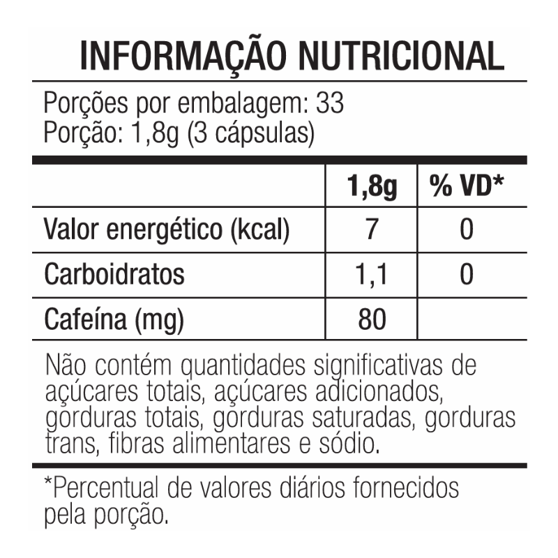 Ingredientes: Guaraná em pó (Paullinia cupana) e gelificante gelatina (cápsula). Não contém glúten